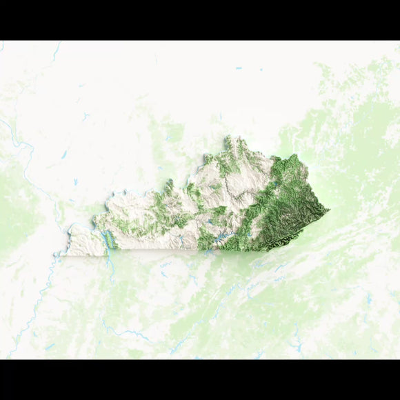 This stunning shaded relief map brings Kentucky's landscape to life. Crafted using high-resolution Digital Elevation Model Data and advanced 3D modeling, exaggerated elevation and strategic lighting create a breathtaking hillshade effect, showcasing the state's natural topography in striking detail.